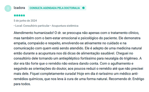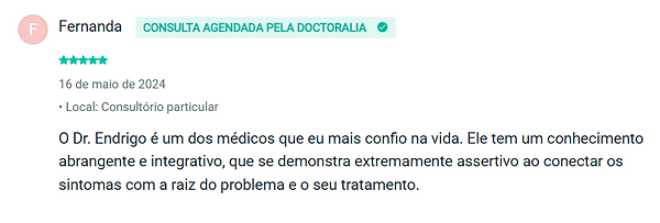 Para mais depoimentos dê uma olhada no site www.doctoralia.com.br e busque por Dr. Endrigo Monte Serrat Prevedello.